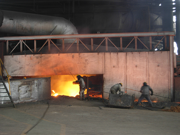 為了保證鐵水正常流動,爐前工必須不停地攪動。由于1#爐的爐前工大都是在爐前工作了多年,臉上的皮膚早已磨煉得適應了這里的高溫。鐵水的溫度高達1470多度,在鐵口鉤殘渣,鐵鉤距離鐵水不過一兩米的距離,腳下踩的耐火磚溫度在200度以上,面前熱度也有200度左右。一個鐵水罐快要灌滿了,一位爐前工來到鐵水罐窺視孔,查看鐵水罐中鐵水的情況,鐵水安全放滿罐后,爐前會及時將鐵水放至另一鐵水罐。大約過了60多分鐘,鐵口處火花噴濺,渣鐵已經出凈。隨后指揮鐵口工操縱液壓泥炮,將鐵口堵住,一爐鐵就此結束。“爐前工不比其他崗位,我們是一個團隊,只有每一個工序做到位、不出錯,才能出好鐵,單靠一個人是完不成的?!?/span>高爐車間主任說。